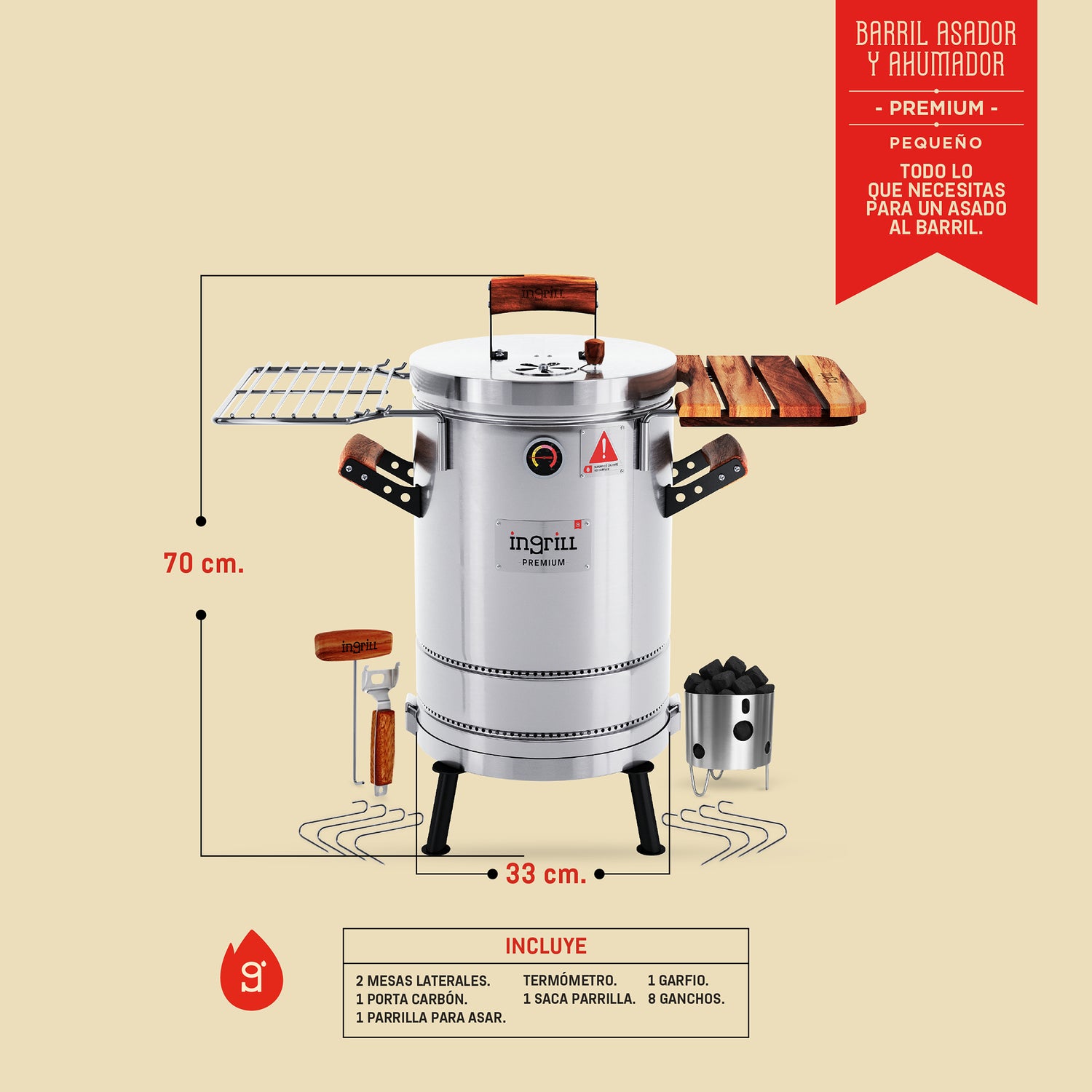 ¡Prepárate para un asado inolvidable con nuestro Barril Ahumador Premium Plateado! Con un diseño industrial y moderno, este ahumador te garantiza un estilo único en tus reuniones. Incluye un kit de accesorios básicos para que tengas una experiencia completa, además de un termómetro para un seguimiento preciso de la temperatura interna. Fácil de armar y usar en exteriores con carbón vegetal. Fabricado con materiales de alta calidad como acero inoxidable y madera de teca. ¡Aprovecha nuestra garantía por defectos de fábrica y disfruta de deliciosos asados con tu nuevo Barril Ahumador!