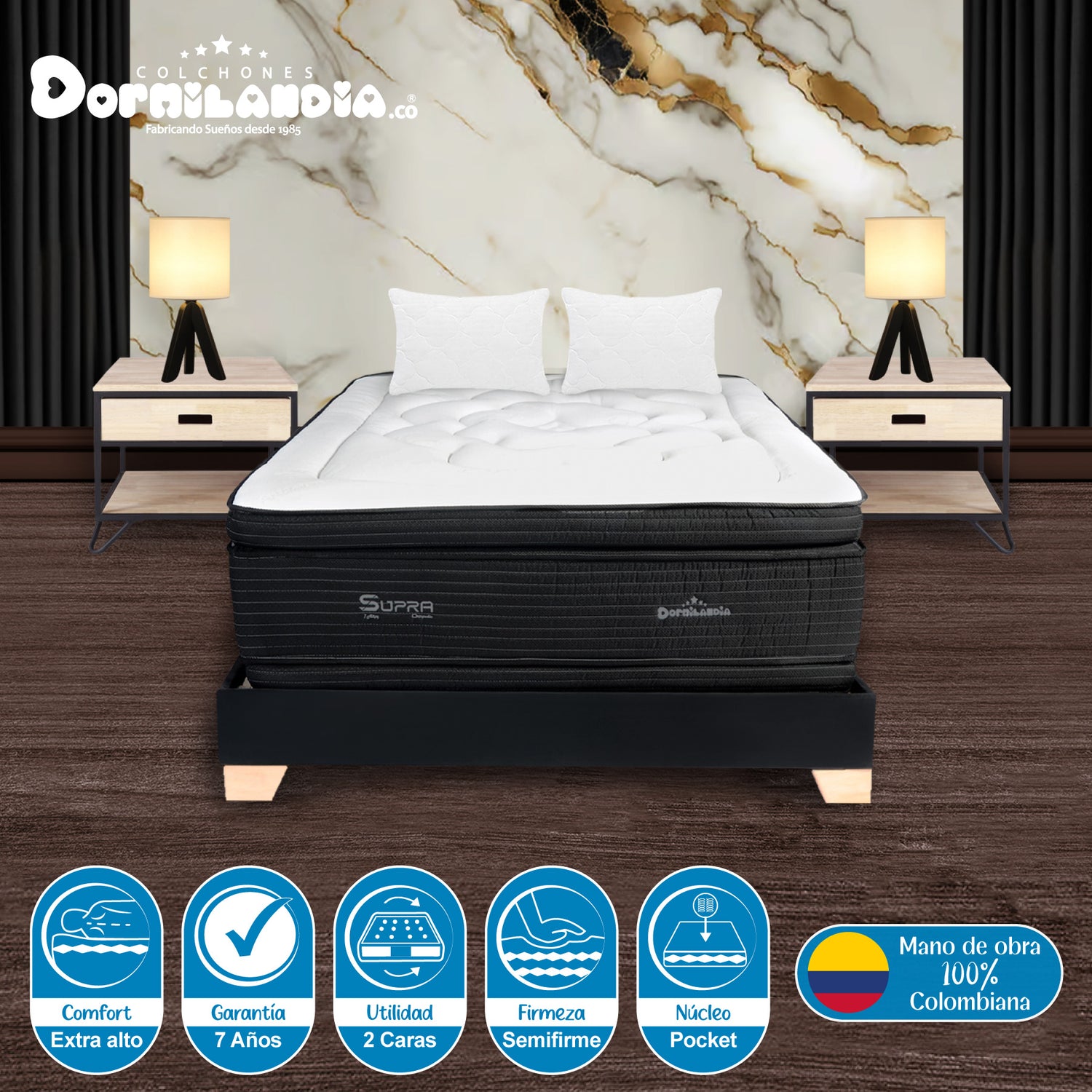 Combo Base Cama y Colchón Supra Negro Semidoble 120 X 190 Cm Firmeza Medio Doble Faz